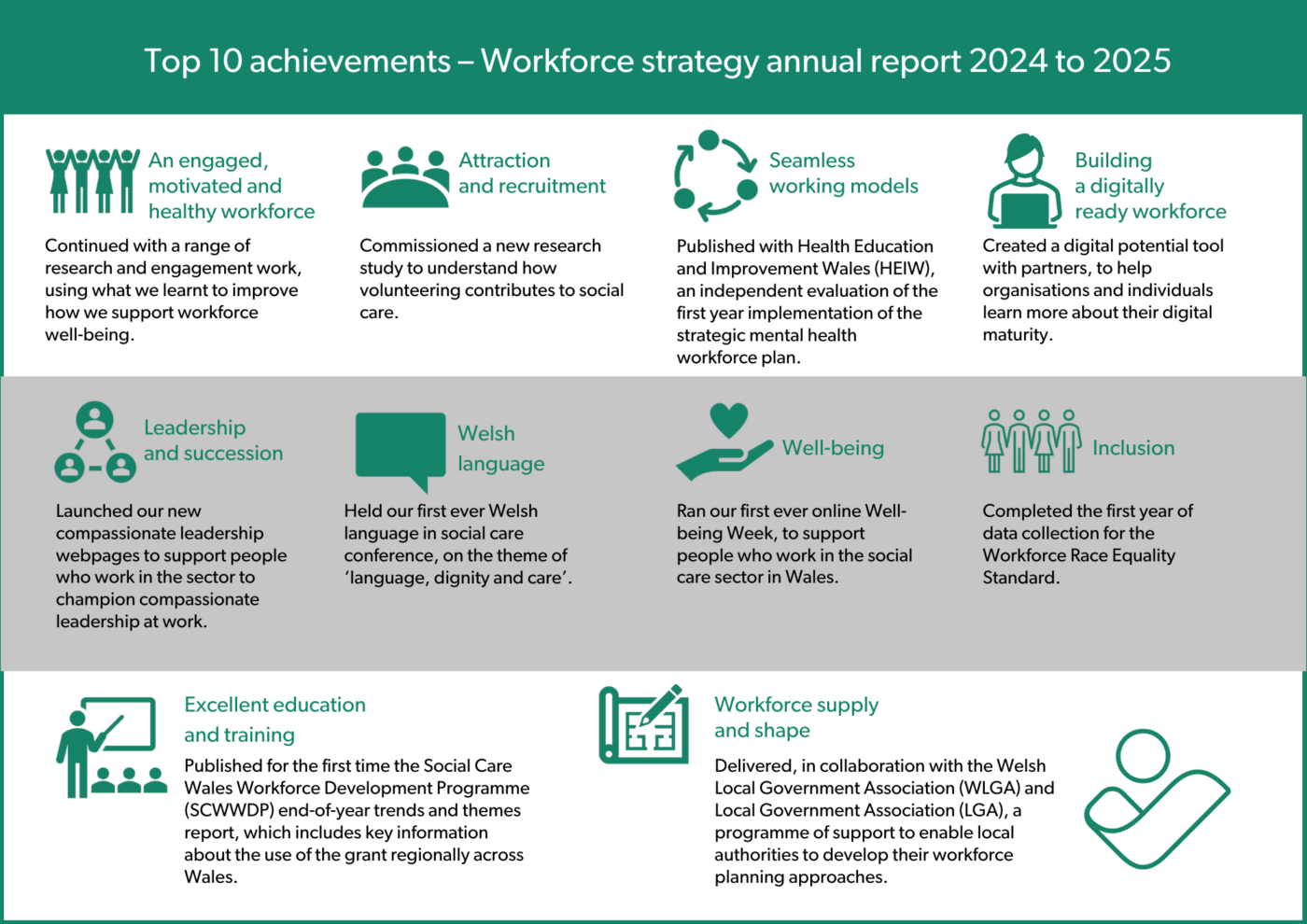 It highlights achievements across the seven workforce strategy themes and three cross cutting themes - well-being, the Welsh language and inclusion. It also sets the direction for continued improvement in the years ahead.